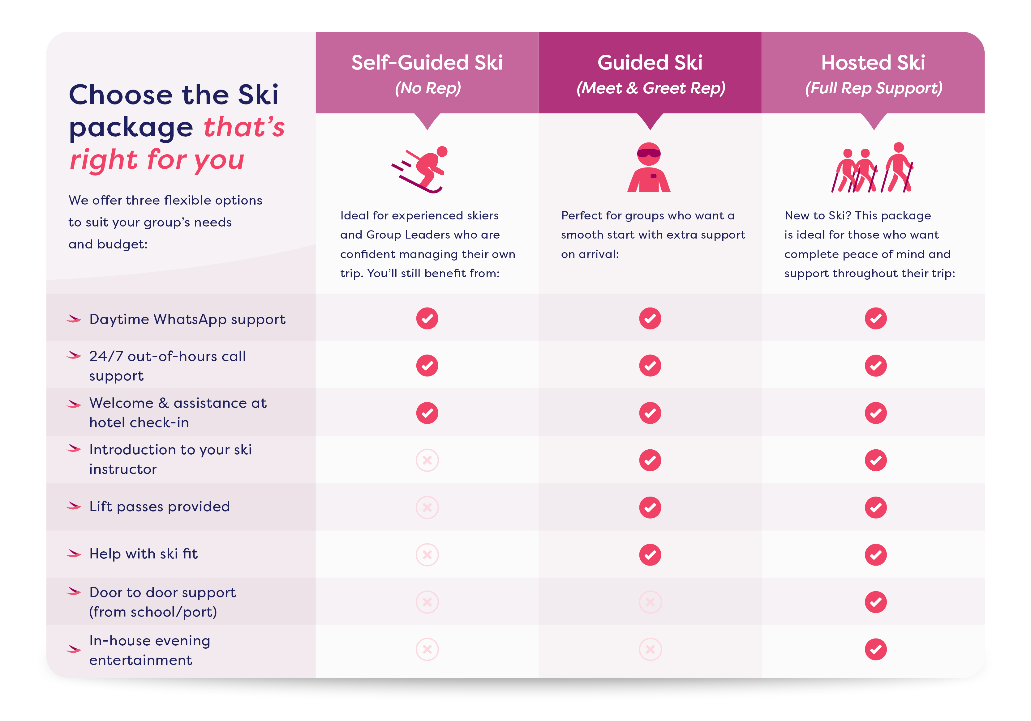 At NST Ski, we make it easy to customise your ski package with three flexible options designed for different needs and budgets. Whether you prefer a self-guided ski experience, a meet-and-greet rep for extra support, or a fully hosted ski trip with complete peace of mind, we’ve got you covered.